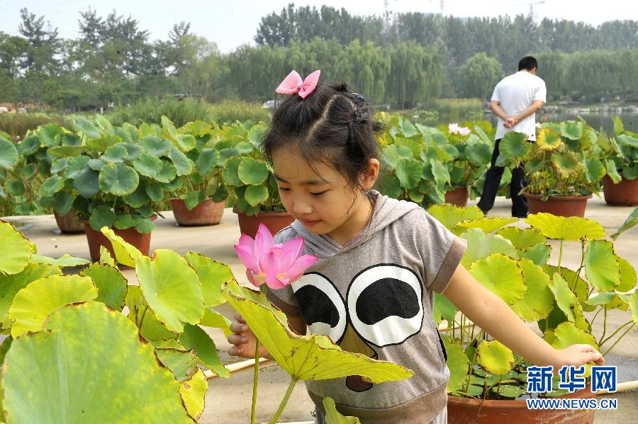 8月29日,一名小女孩儿在河北省三河市燕郊植物园内观赏展出的荷花。河北省三河市燕郊植物园近日举办首届荷花展,共展出近60个品种的3000余盆荷花,吸引了众多游客前来游园赏花。 新华社记者鲁鹏摄
