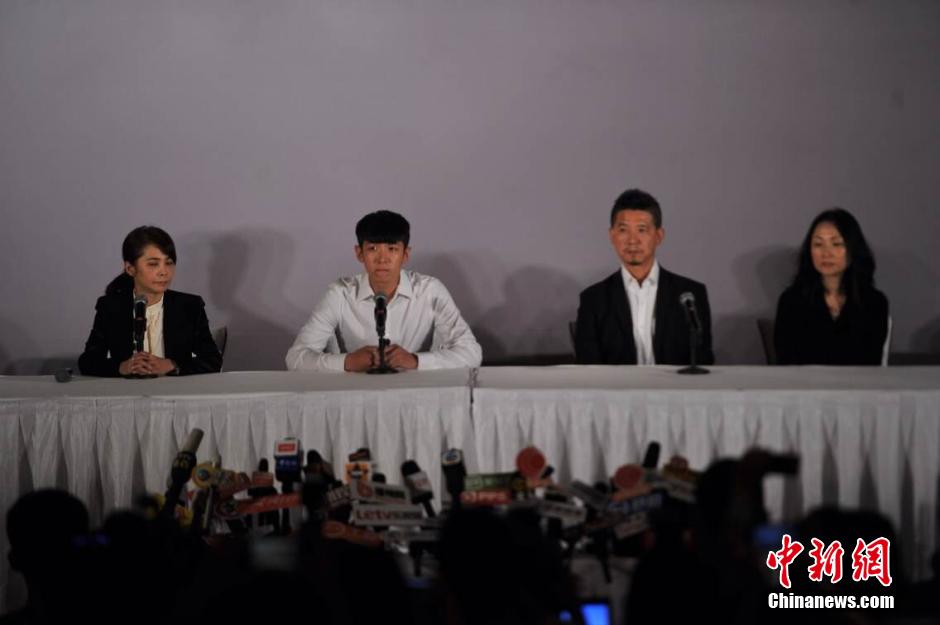 8月29日,因吸毒被行政拘留14天的台湾男星柯震东在北京丽晶酒店举行道歉发布会。柯震东于8月29日凌晨获释,并在父母的陪伴下乘车回到酒店。图为柯震东及家人出席道歉会。 中新网记者 金硕 摄