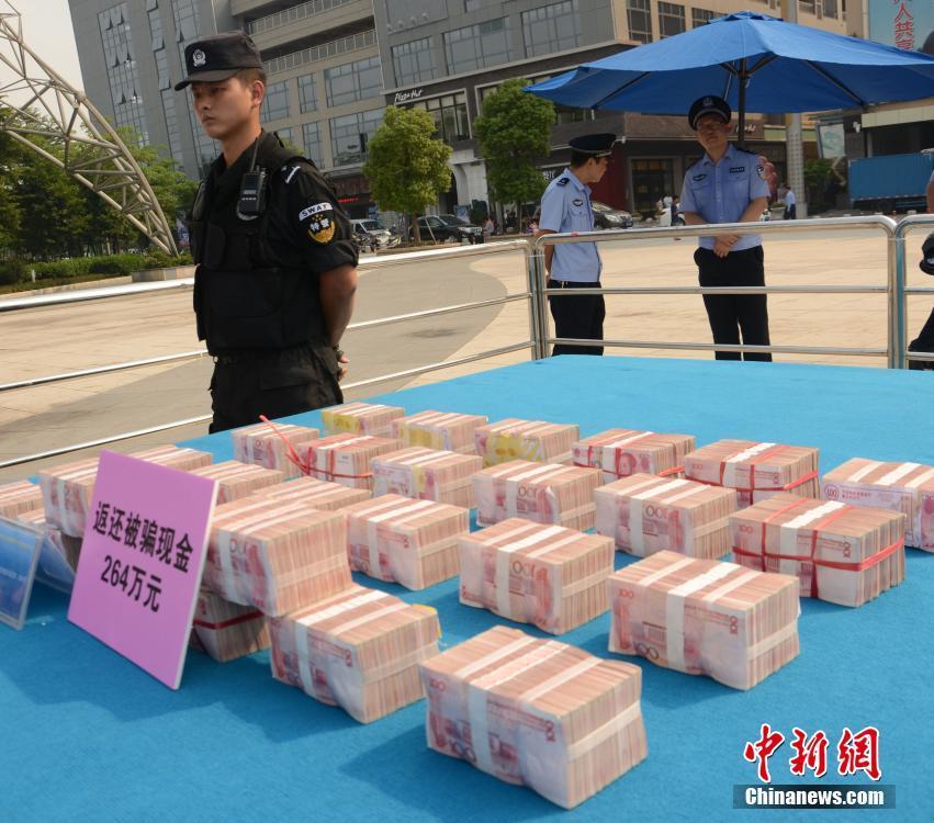 8月30日,广东肇庆警方把新闻发布会开到市民聚集的广场,除现场返还市民被诈骗的260万现金外,现场还展示了一大批收缴的诈骗工具及咨询宣传预防电信诈骗及银行卡犯罪。