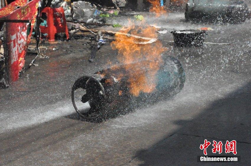 消防官兵赶到现场后发现两个燃气罐已经被引燃。