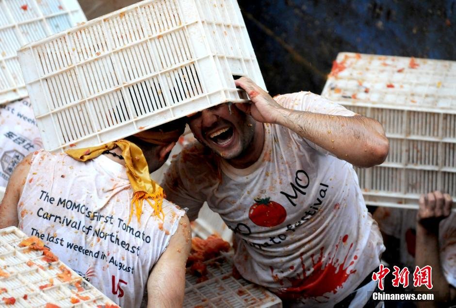 8月30日,沈阳首届西红柿大战子在胜利大街商业步行街内上演,年轻男女以西红柿为武器在一片红色的海洋中混战。中新社发 沈阳张鹏 摄 图片来源:CNSPHOTO