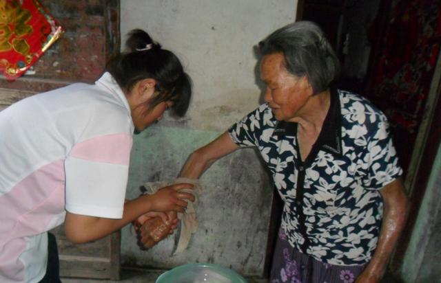 每次帮奶奶擦拭,夏倩倩都很用心。 朱鼎兆 摄。