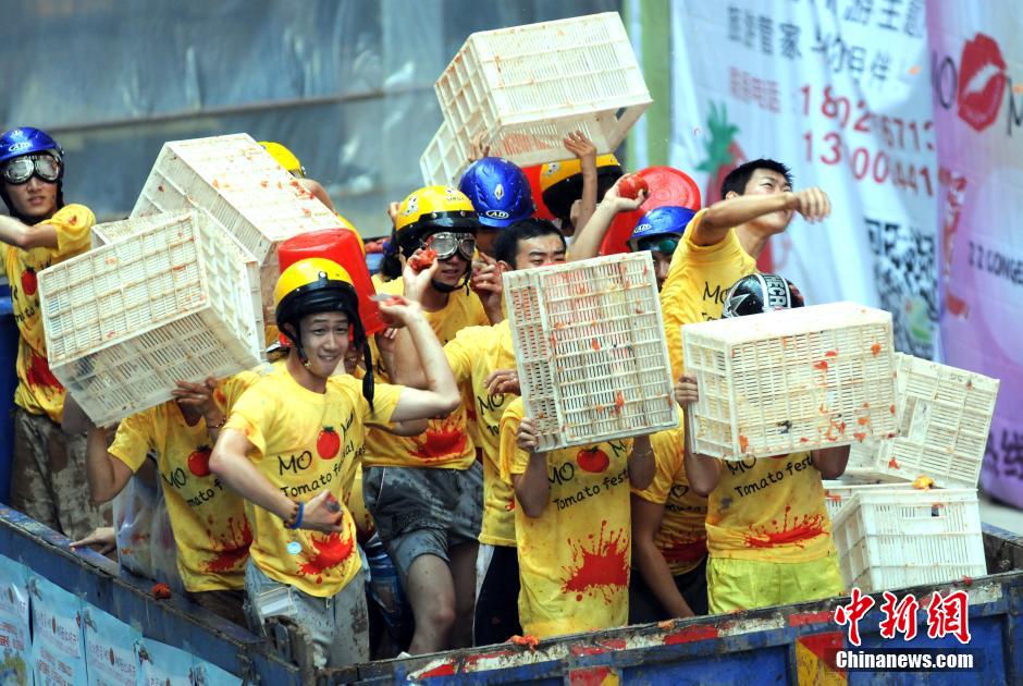 8月30日,沈阳首届西红柿大战子在胜利大街商业步行街内上演,年轻男女以西红柿为武器在一片红色的海洋中混战。中新社发 沈阳张鹏 摄