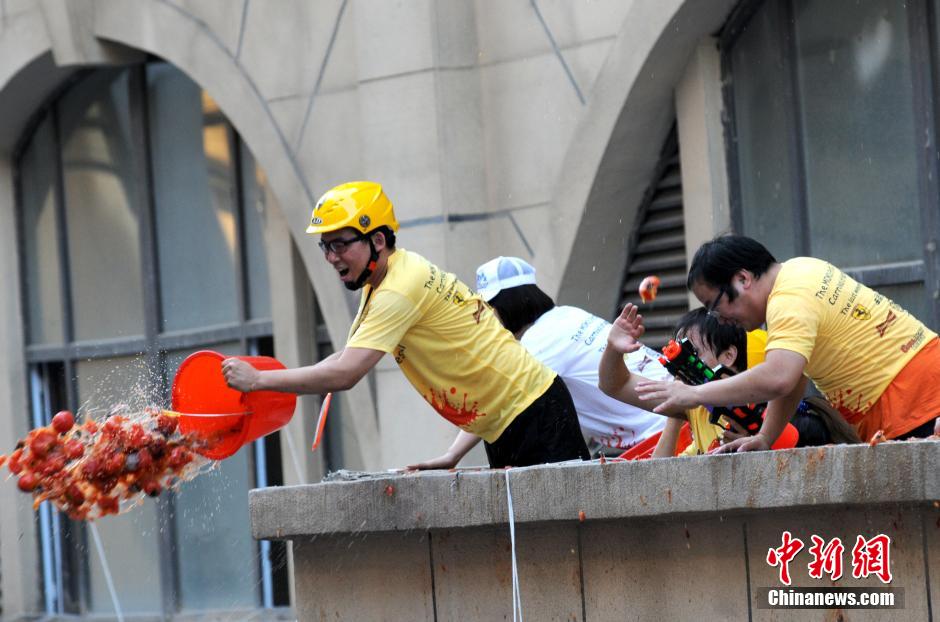 8月30日,沈阳首届西红柿大战子在胜利大街商业步行街内上演,年轻男女以西红柿为武器在一片红色的海洋中混战。中新社发 沈阳张鹏 摄
