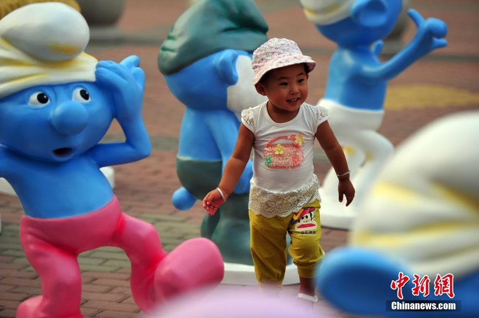 8月31日,市民与蓝精灵合影。当日,50余个形态可掬的蓝精灵亮相沈阳街头,一亮相就吸引了众多市民的喜爱,纷纷与其合影,现场不少80后,一边拍照一边与同伴一同回忆小时候看动画片“蓝精灵”时的情景。漫画蓝精灵是1958年由比利时漫画家沛优(Peyo)及其夫人共同创作。1981年美国国家广播公司购买版权,制作并播放美国版的《蓝精灵》动画片。中新社发 于海洋 摄