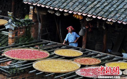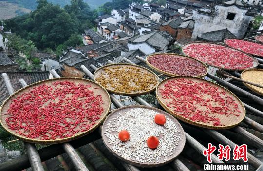 金秋时节,在被誉为“中国最美乡村”的江西省婺源县江湾镇篁岭村的村民用竹晒匾将收获的红辣椒、稻谷、玉米等农作物晾晒在徽式民居的晒架上,绘就了一幅安详、恬静的山村“晒秋”图。篁岭村,地处婺源石耳山脉,上百栋徽派古民居在百米落差的坡面错落排布,属典型山居村落。