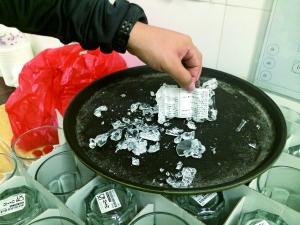 据耿先生介绍,8月29日下午2点多,他们在宜家四元桥店因商用买了50个博克尔玻璃杯。“杯子买回来后就一直放在餐厅一进门的桌子上待用。谁想到,当天晚上8点多,其中一个杯子竟在未使用、无高温等没有任何特殊条件环境的情况下,突然发生了爆炸,瞬间被炸碎了!当时杯口朝上放置,杯底仍飞起一米多高,炸碎的杯子玻璃碴子满天飞,将站在旁边的一名餐厅合伙人手指刺伤了一小口子。”耿先生说,事后他们发现,除了被炸碎的杯子外,其他放在一块儿的杯子没有受到丝毫影响。“但我们不知道剩下的杯子会不会以后也发生类似情况,所以一个都没敢用,在收拾完现场满地的碎玻璃后,就把其他杯子都放到了厨房通道内。”