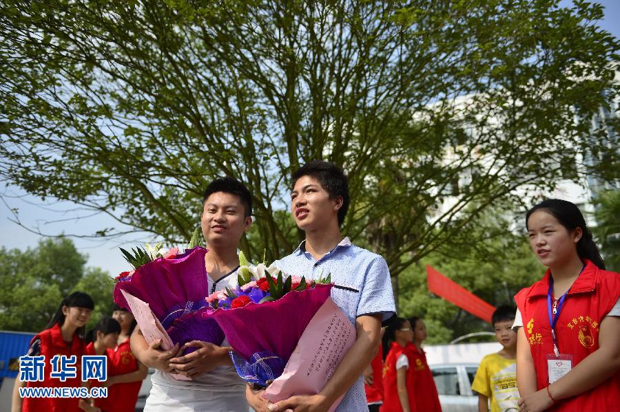 9月1日,柳艳兵(前右)和易政勇在欢送仪式上合影。当日是全国各中小学开学日,江西宜春市政府在宜春三中为“夺刀少年”柳艳兵和易政勇举行欢送仪式,并为其颁发助学慰问金,每人获得各界捐助5万元。据两人介绍,他们的伤口已经长好,生活行动基本不受影响,但偶尔还会疼痛。柳艳兵和易政勇表示将会努力学习,不辜负大家的关心。 5月31日,一名歹徒在宜春市区至袁州区金瑞镇的中巴车上行凶,柳艳兵及其同学易政勇勇斗歹徒,因伤情严重错过了高考。7月2日至3日,柳艳兵、易政勇参加了单独高考考试,并被南昌大学和江西财经大学录取。新华社记者周密摄