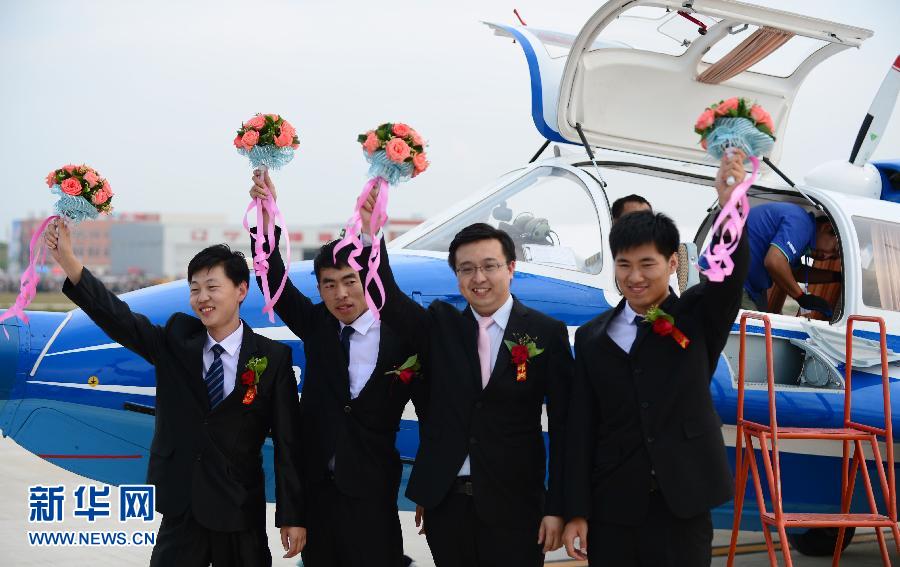 8月31日,新郎们准备迎接新娘。当日,在第三届沈阳法库国际飞行大会暨2014沈阳航展的最后一天,主办方为四对新人举行了浪漫的空中婚礼。新华社记者 杨青 摄