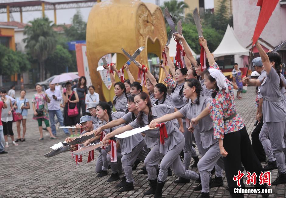 9月1日,重庆30余名大叔大妈们身着八路军服装,手持尖刀在重庆洋人街跳着自编舞蹈纪念第二次世界大战日本投降69周年。中新社发 陈超 摄