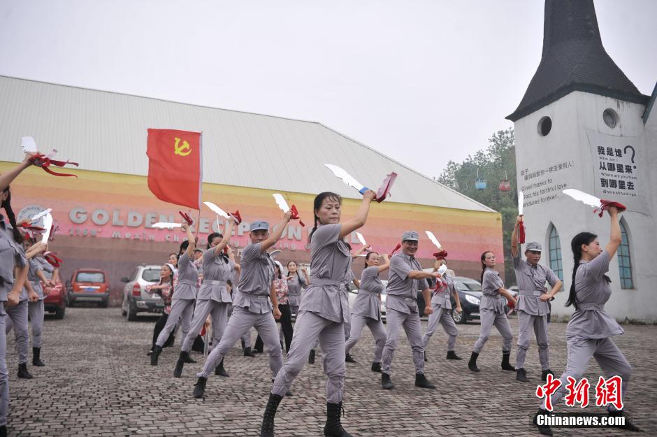9月1日,重庆30余名大叔大妈们身着八路军服装,手持尖刀在重庆洋人街跳着自编舞蹈纪念第二次世界大战日本投降69周年。中新社发 陈超 摄