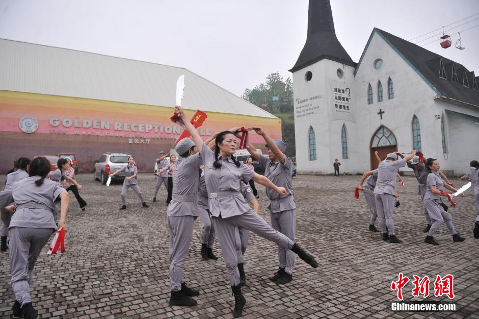 9月1日,重庆30余名大叔大妈们身着八路军服装,手持尖刀在重庆洋人街跳着自编舞蹈纪念第二次世界大战日本投降69周年。中新社发 陈超 摄