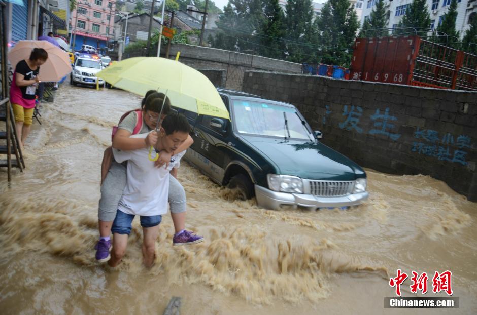 9月1日,受持续强降水影响,重庆巫溪县遭受严重暴雨洪灾。记者从巫溪县委宣传部获悉,截至当日14时,巫溪县仍有17个乡镇(街道)通讯中断,该县3条省道全部中断,省、县道共计断道41处。目前暂无人员伤亡报告。图为一名家长正背着学生,经过积水路道。谢道玖 摄