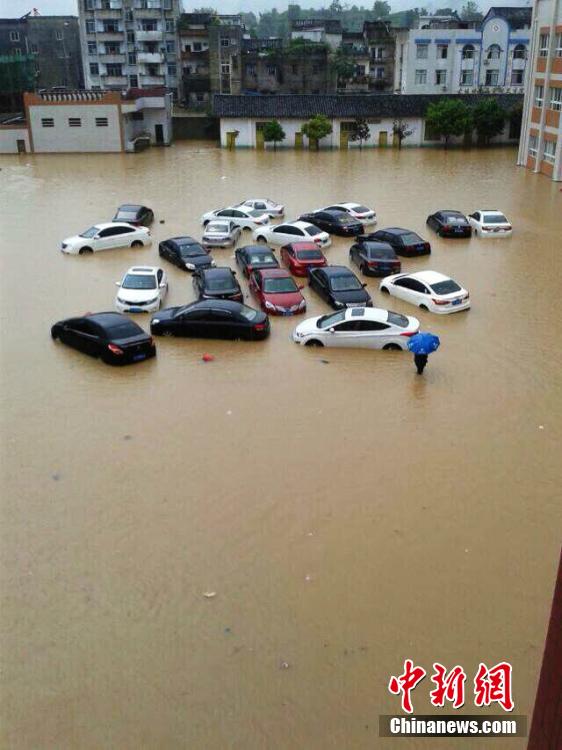 9月1日,受持续强降水影响,重庆巫溪县遭受严重暴雨洪灾。记者从巫溪县委宣传部获悉,截至当日14时,巫溪县仍有17个乡镇(街道)通讯中断,该县3条省道全部中断,省、县道共计断道41处。目前暂无人员伤亡报告。图为巫溪县古路中学校园内被水淹没的车辆。谢道玖 摄