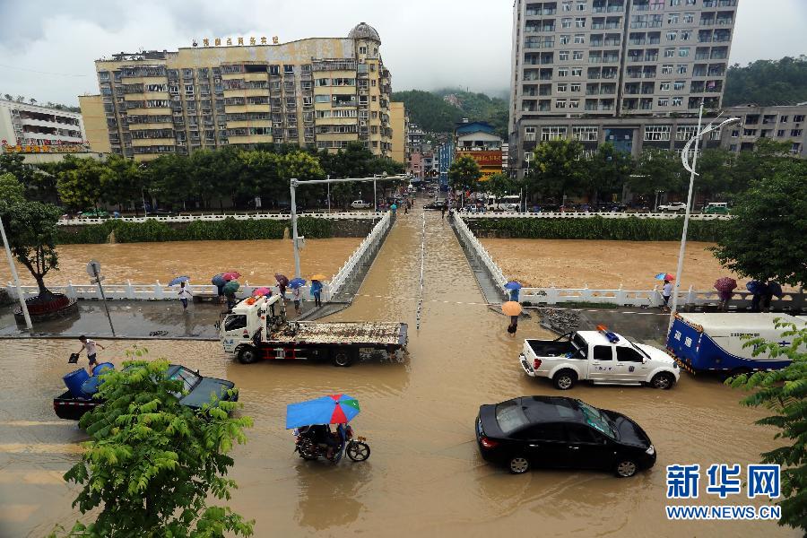 9月1日拍摄的洪水中的巫溪县城。 9月1日,受持续强降水影响,重庆巫溪县遭受严重暴雨洪灾。截至1日14时,全县仍有17个乡镇(街道)通信中断,灾情正在进一步统计中。据巫溪县应急办介绍,8月31日21时至9月1日10时,巫溪县普降暴雨,蒲莲、县城、前河、田坝、文峰、上磺等8个观测点的降雨量超过100毫米。新华社发(谢道玖 摄)