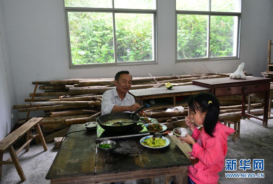 9月1日,湖北恩施龙凤镇大龙潭村杉树湾教学点的谢世魁老师和学生刘欣怡一起吃午饭。新华社发(杨顺丕 摄)
