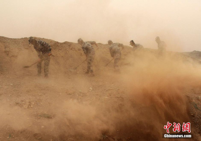 进驻野外演练场3个月来,该旅远程机动2万余公里,跨越6个省区,组织战斗演练10余次,完成演练内容百余项,连续实兵交战数小时,全体参演官兵经受了一场实战条件下的野战生死考验。图为2014年8月,西北大漠戈壁,广空导弹某旅官兵在沙尘暴中掩埋生活垃圾,一日三次雷厉风行。