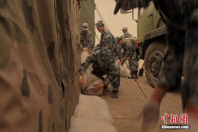 2014年8月,西北大漠戈壁,广空导弹某旅官兵用沙袋和铁丝加固帐篷,抗击沙尘暴。