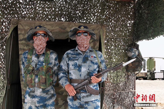 2014年8月,西北大漠戈壁,广空导弹某旅两名战士在高温和强紫外线下坚守岗位。