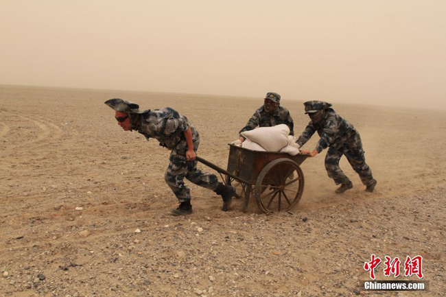2014年8月,西北大漠戈壁,广空导弹某旅三名官兵在强沙尘暴中拉沙袋,步履艰难。