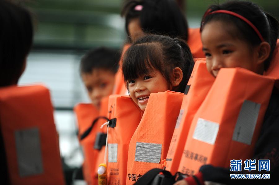 9月1日,陀头小学学生在“求知号”渡轮上。 9月1日是海南省东方市感城镇陀头小学开学的日子,为保障陀头渡口在校师生的乘渡安全,海南东方八所海事局组织青年志愿者来到渡口现场维护渡运秩序,并开展水上安全知识进校园活动,护航边远山区黎族学生“求学梦”。陀头小学位于感城镇陀头村,绵延十余公里的陀兴水库把陀头村的6个自然村南北隔开,村中唯一的小学在北岸,南岸村庄的36名黎族孩子靠摆渡上学。以前学生乘坐的船舶船况较差,在八所海事局的多方协调下,相关部门为该校建造了一艘符合规范的“求知号”渡船。同时,八所海事局团支部牵头成立青年志愿者爱心护送队,对孩子们开展青年志愿者爱心护送活动,确保学生安全上下学。新华社发(夏一方摄)