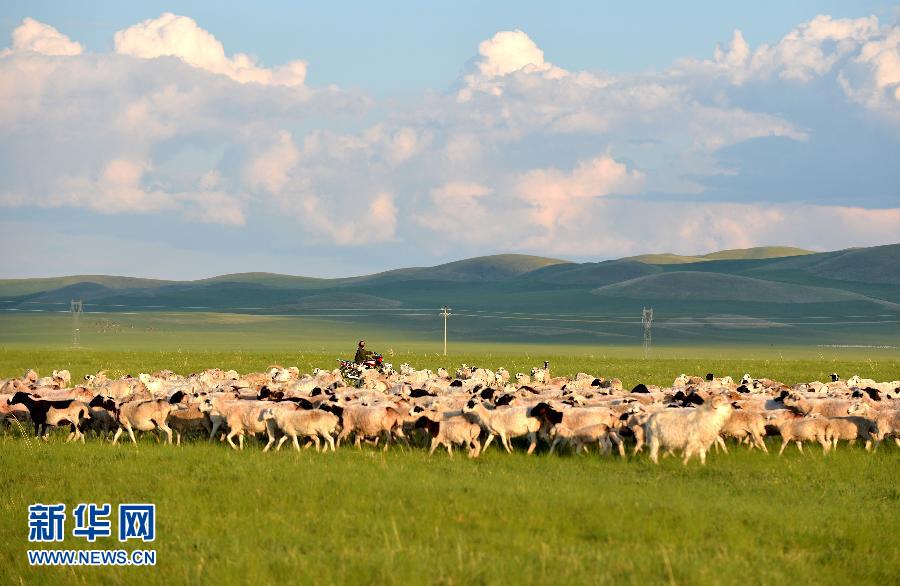 一名牧人骑着摩托车在锡林郭勒草原上牧羊(6月27日摄)。据内蒙古自治区统计局农产量调查队普查结果显示,截至6月末,内蒙古羊存栏首次突破1亿大关,达到10091.03万只,与上年相比增幅达到11.8%。新华社记者 任军川 摄