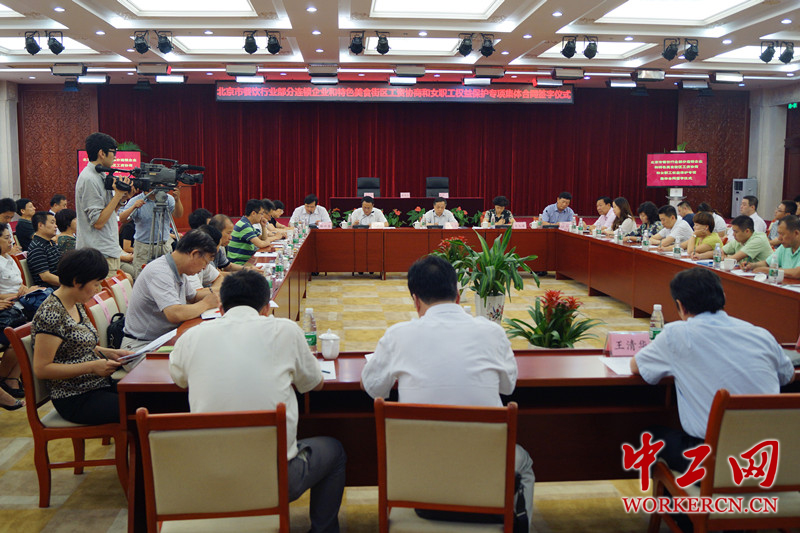 2014年9月1日,北京市总工会、北京市餐饮协会组织部分餐饮企业举行了《北京市餐饮行业部分连锁企业和特色美食街区工资协商专项集体合同》、《北京市餐饮行业部分连锁企业和特色美食街区女职工权益保护专项集体合同》签字仪式。中工网记者 葛姗 摄