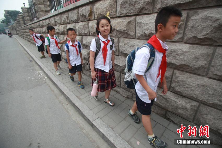 2014年09月01日,济南,开学首日,在运署街上,不少小学生从备受人们关注的“最窄人行道”去往上学之路。 有家长反映,虽然人行道由原来的20厘米加宽了40多厘米,但是这里分别有两所学校,几千名学生由此途径上学,清晨高峰期两道车辆拥堵时,学生前行成难题。图片来源:CFP视觉中国