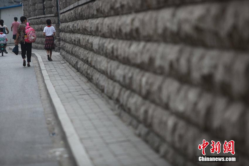 2014年09月01日,济南,开学首日,在运署街上,不少小学生从备受人们关注的“最窄人行道”去往上学之路。 有家长反映,虽然人行道由原来的20厘米加宽了40多厘米,但是这里分别有两所学校,几千名学生由此途径上学,清晨高峰期两道车辆拥堵时,学生前行成难题。图片来源:CFP视觉中国