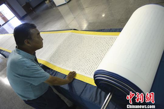 9月2日,描述成吉思汗的书法长卷受到关注。据悉,该长卷是内蒙古通辽一蒙古族人士历时2年多时间用蒙文小楷书法写成,书写内容是描述成吉思汗生平书目的《千年风云第一人》,约20万字,已收入大世界吉尼斯纪录。刘文华 摄