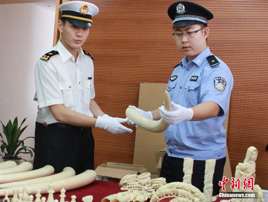 9月2日,宁波海关查获一批走私珍贵动物制品,包括大象头骨1个、象牙制品1158件、河马牙齿制品、鳄鱼类制品、蟒蛇皮及其制品、将军巨蝎标本等若干,总价值超过280万元。这些动物制品经权威机构鉴定,大多在《濒危野生动植物种国际贸易公约》附录中有明确列名,属于禁止进出境的珍贵动物制品。目前海关已将这批查获的珍贵动物制品移交给宁波市林业局。图为宁波海关关员清点移交珍贵动物制品。中新社发 林波 摄
