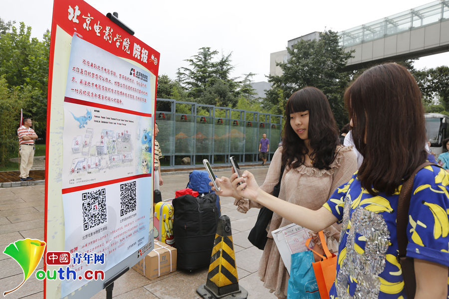 9月2日,北京电影学院迎来2014级新生,图为学生扫描二维码关注北京电影学院官方微信,以便及时了解招生信息、校园动态、学术活动等信息。