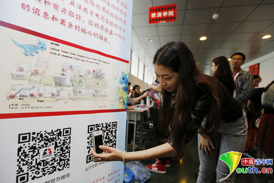 9月2日,北京电影学院迎来2014级新生,图为学生扫描二维码关注北京电影学院官方微信,以便及时了解招生信息、校园动态、学术活动等信息。