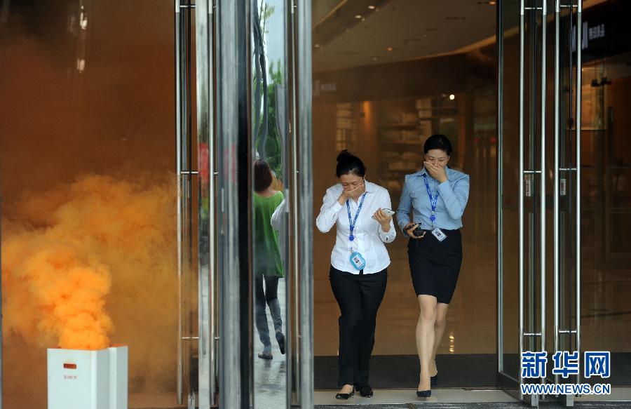 9月2日,两名商场工作人员在火灾演练中“逃生”。新华社记者 刘军喜 摄