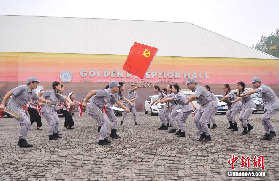 9月1日,重庆30余名大叔大妈们身着八路军服装,手持尖刀在重庆洋人街跳着自编舞蹈纪念第二次世界大战日本投降69周年。中新社发陈超摄