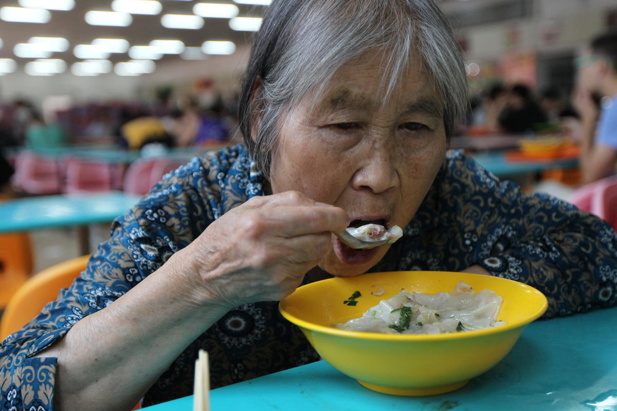 2014年8月30日,长春,张淑芳在吉林大学南岭校区的学校食堂吃饭,老人一日三餐都在大学食堂解决。老人走到哪儿,都拎着一个小布包,里面装着一部手机、心脏急救药、脑梗急救药,医保卡,一瓶自己灌的凉白开水。“这是医生告诉我的,我每次住院都自己打车去,医生看我没人陪着,就说把这些药物随身带着,以免发生意外。”