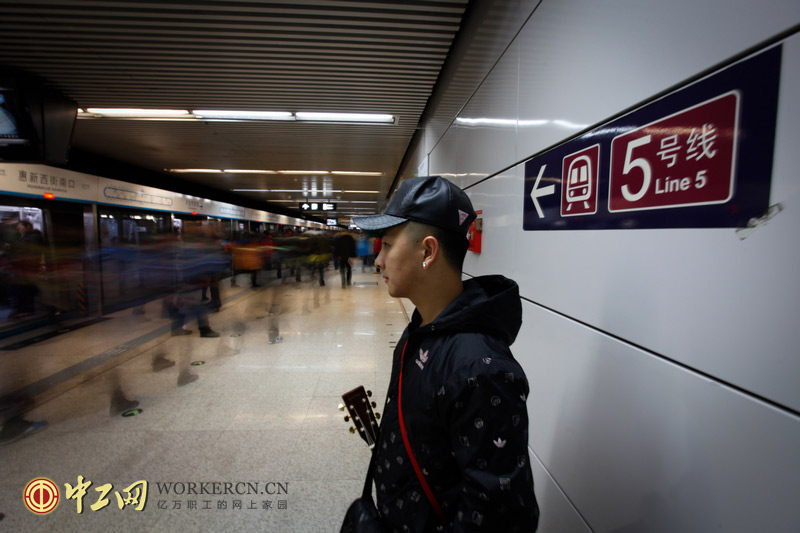 像这样的故事在胡忠军身上发生了很多,胡忠军说,他每天晚上在地铁里唱歌,看到那些疲惫不堪的人们都会唱一些励志的歌曲,希望用自己的歌声鼓励他们,温暖那些想家的人。(中工网记者 韩靖摄)