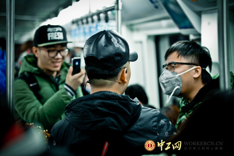 还有一次,胡忠军正在唱《爱的代价》,走到一个二十多岁的男孩身边,男孩听着歌泪流满面,抱着胡忠军大哭起来,后来聊天得知男孩失恋了,而且因为工作忙很久没有回老家,心里很难受。有时乘客也会和他一起互动,一起合唱。(中工网记者 韩靖摄)