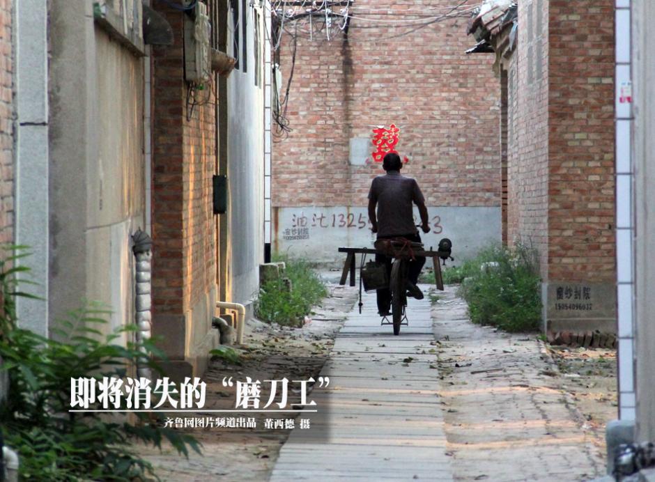 “磨剪子喽,戗菜刀喽!”以前,时常能够在街头巷尾听到这样的吆喝声。然而随着时间的流逝与时代的变迁,“磨刀工”已经渐渐成为历史,这种民间“特殊行业”也渐渐在人们的视野中消失。温玉庭就在这样每天用“磨剪子喽,戗菜刀喽!”的吆喝声中默默坚守着。忙完一阵,温玉庭骑上“大金鹿”自行车,消失在巷尾。不知道温玉庭的吆喝声什么时候还会来,还会吆喝多久。 齐鲁网发 董西德 摄 图片来源:齐鲁网
