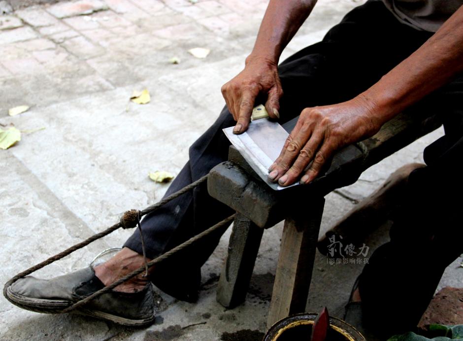 温玉庭脚上的布鞋已经破旧不堪,但依然能配合熟练的磨刀动作。“别看这双布鞋,可给力了,要是穿双皮鞋,还不能工作呢!”温玉庭边磨刀边兴奋地说。 齐鲁网发 董西德 摄 图片来源:齐鲁网