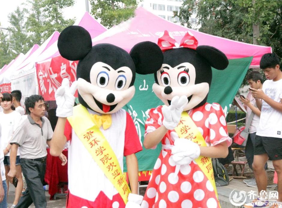 图为学院在迎新中打起“动漫”牌,学长装扮米奇米妮志愿者迎新。 图片来源:齐鲁网