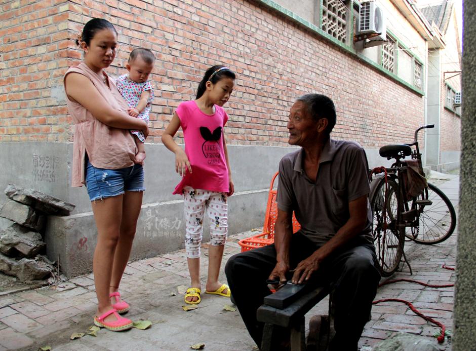 有时候,温玉庭的生意也会不错。一把钢刀磨好,顾客又递上一把剪刀。一边磨刀,一边逗娃娃玩笑。 图片来源:齐鲁网