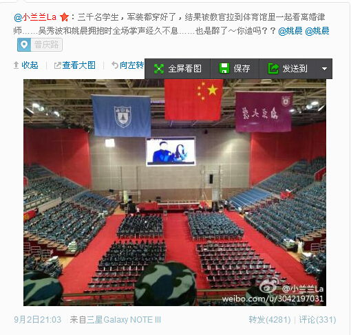 “三千名学生,军装都穿好了,结果被教官拉到体育馆里一起看离婚律师……吴秀波和姚晨拥抱时全场掌声经久不息……也是醉了~你造吗??@姚晨@姚晨。”@小兰兰La这样一条微博一发,随即引发围观。随后更是惊动“姚晨”,姚晨转发并回复:“三千人如此正式的集体围观,演员好害羞的说…”,引发大量网友关注。