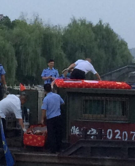 在海宁市河里,还停着一艘警用快艇和多艘工程船,海宁水警、派出所民警及海事部门的有关人员正对此事进行调查。