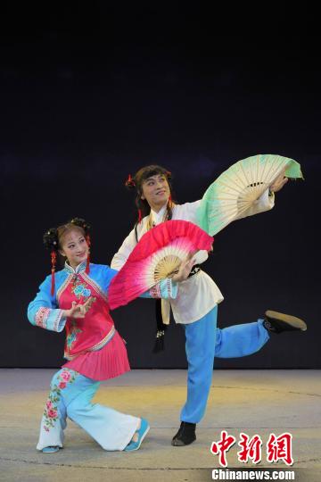 9月3日,广西柳州市艺术剧院里,青年彩调演员在带妆彩排。图为传统彩调小戏《跑菜园》定妆剧照。 王运鹏 摄