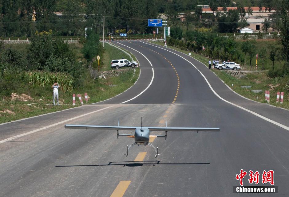 9月4日,北京警方的无人机飞赴延庆张山营镇山区进行空中查毒。这部HW-220无人机机身长约两米,在机腹下方设置的探头可大面积扫描地表情况,飞行高度在3000米左右,最大续航能力达到6小时。今年以来,警方利用卫星遥感、无人机航拍、警用直升机监测等手段,对北京北部3000余平方公里山区进行重点监控,截至目前未发现毒品原植物种植问题。中新社发 蒋盛松 摄