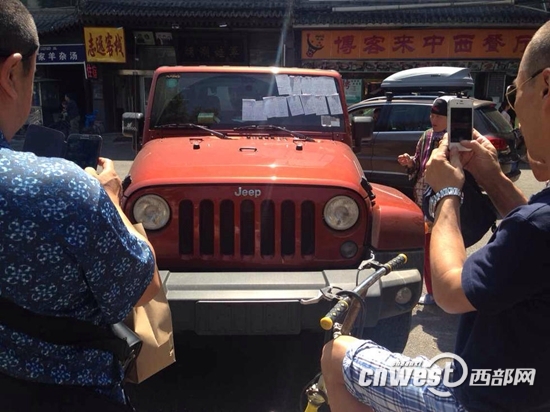 据王波介绍,当天执勤民警在大皮院东口发现这辆无牌且违停的红色牧马人越野车,随即开出一张罚单贴在了车窗玻璃上。随后,该民警转向其他路段执勤,可当民警再次回到此处时,发现违停车辆还在,罚单却不翼而飞。