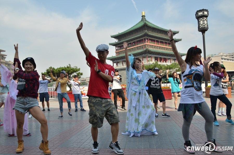 图为西安钟楼“快闪”,筷子兄弟和韩庚的粉丝们以这种方式迎接偶像到来。 图片来源:西部网