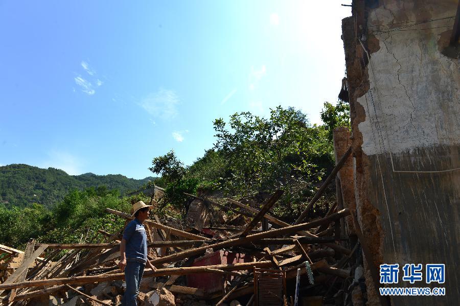 9月4日,秭归县泄滩乡徐家山村一组一村民站在倒塌的房屋前。受连续降雨影响,三峡库区湖北省秭归县近日出现滑坡17处,有5处较大滑坡体发生坍滑,造成229户房屋倒塌,紧急转移安置2400余人。灾情发生后,当地迅速组织干部群众奋力抢险救灾,恢复家园。新华社发(郑家裕 摄)