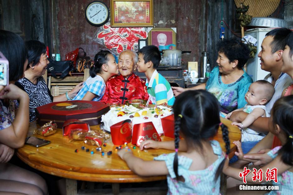 9月7日,湖南省临武县双溪乡大岭村村民骆火德(红色衣服)一家五代共度中秋佳节,并为她庆祝108岁生日。每逢中秋节,骆火德的晚辈们都会放下手中的工作,回到老人身边,共享天伦之乐。 陈卫平 摄